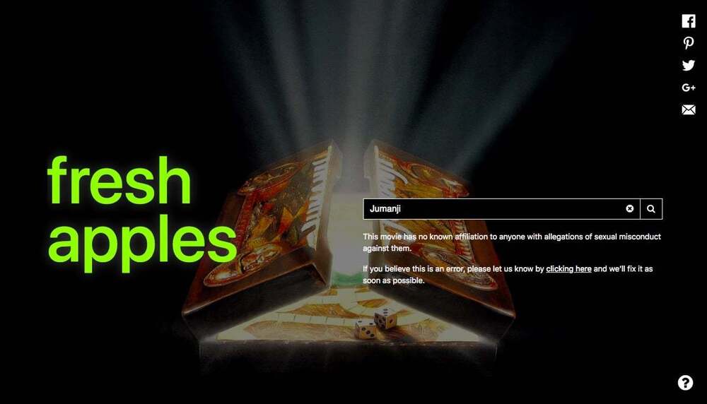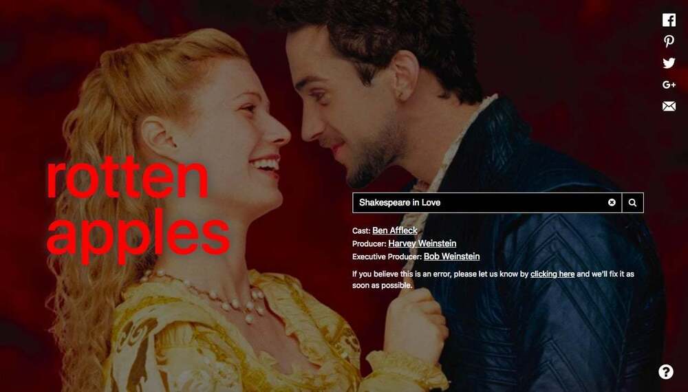 Yanlış duymadınız adı Rotten Apples. Hayır, bu Rotten Tomatoes sitesinin bir uzantısı değil ve evet, adı neredeyse aynı. Arayüzü çok basit olan sitede arama çubuğuna skandala karışıp karışmadığını merak ettiğiniz bir yapımın adını yazıyorsunuz. Eğer skandala karışmışsa kırmızı renkle “rotten apple” (çürük elma) yazıyor ve kişinin karıştığı olaylarla ilgili haberler altında sıralanıyor. Eğer yapımın içerisinde çalışmış herhangi birinin karıştığı bir skandal yoksa da o zaman “fresh apple” (temiz elma) yazıyor yeşil renkle.