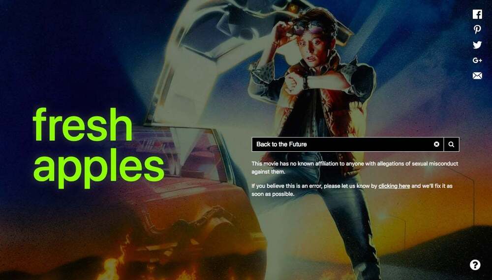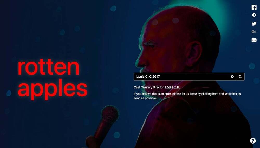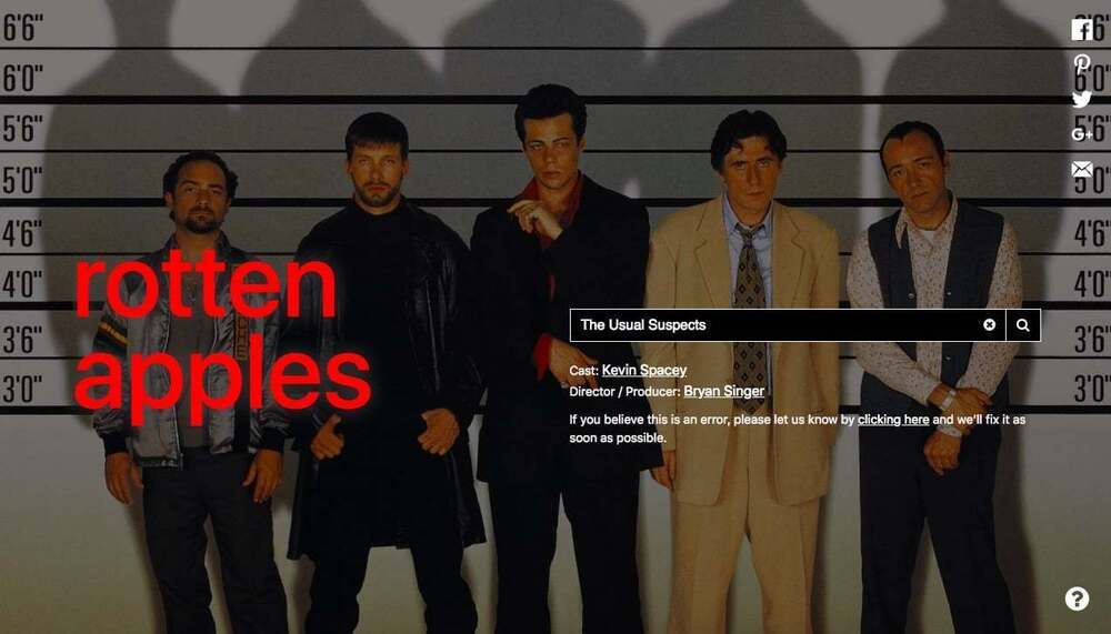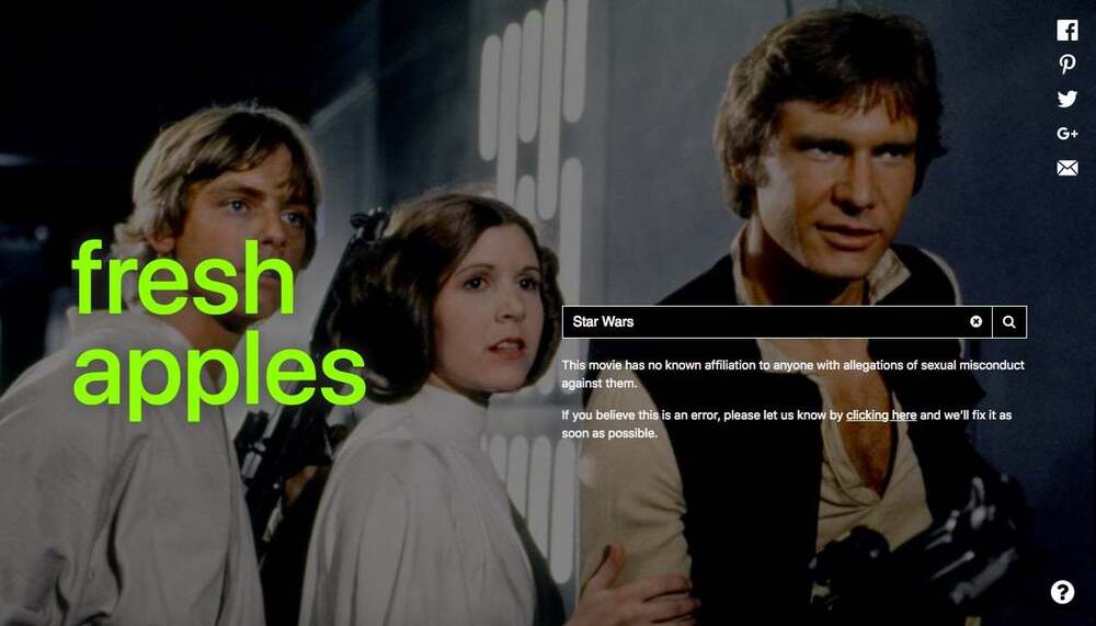 Yanlış duymadınız adı Rotten Apples. Hayır, bu Rotten Tomatoes sitesinin bir uzantısı değil ve evet, adı neredeyse aynı. Arayüzü çok basit olan sitede arama çubuğuna skandala karışıp karışmadığını merak ettiğiniz bir yapımın adını yazıyorsunuz. Eğer skandala karışmışsa kırmızı renkle “rotten apple” (çürük elma) yazıyor ve kişinin karıştığı olaylarla ilgili haberler altında sıralanıyor. Eğer yapımın içerisinde çalışmış herhangi birinin karıştığı bir skandal yoksa da o zaman “fresh apple” (temiz elma) yazıyor yeşil renkle.