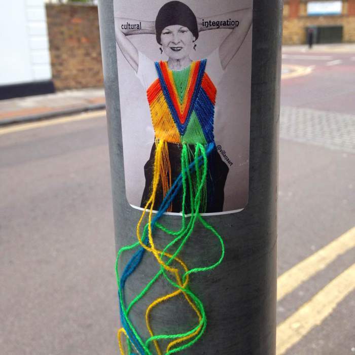 Sanatçı Victoria Villasana sadece kıyafetleri tekstil katmanlarıyla donatmıyor. Ayrıca sanatçı, sanatını sokağa taşırıyor. Sokak sanatçılarıyla birlikte çalışarak ya murallerin bazı parçalarını örerek yeni ve özgün işler ortaya çıkarıyor ya da üzeri örülü çıkartmalar ile sokaklara imzasını bırakıyor.