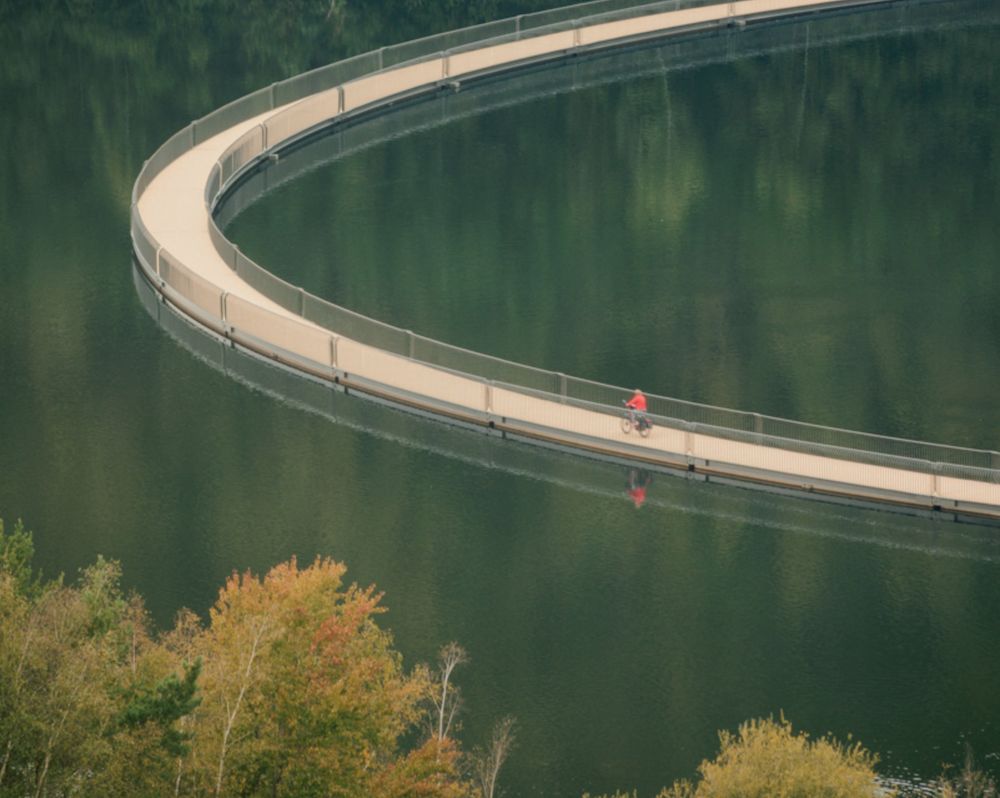 400 metrelik bir alana yayılan köprü, Belçika’nın en uzun yüzen bisiklet köprüsü ve eşsiz bir simge yapı. 30 adet menteşeli modüler elemanı, 130 santimetreye kadar yükselen veya düşen su seviyelerine esnek bir şekilde uyum sağlamasına olanak tanıyor. Mühendislik ve tasarımın bu kombinasyonu; peyzaj, doğa ve alanın madencilik geçmişi arasında simbiyotik bir ilişki yaratıyor.