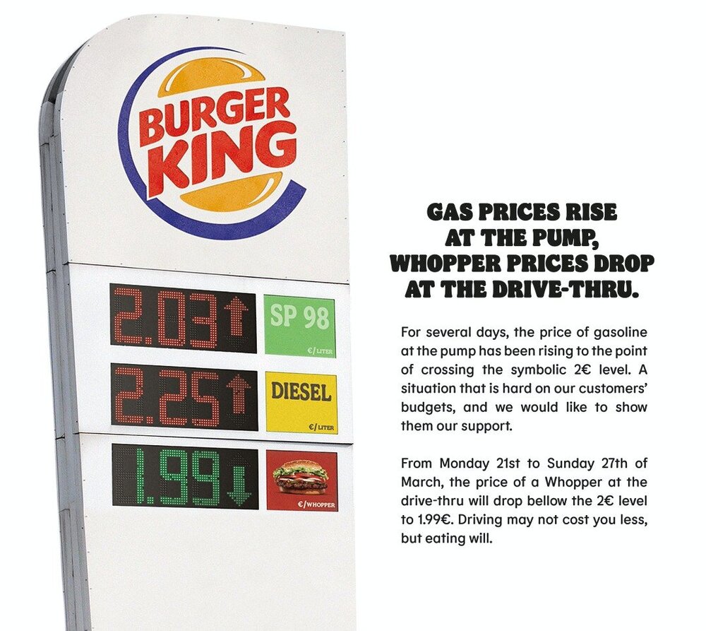 Sürücülere biraz olsun nefes aldırmayı amaçlayan Burger King Fransa, araca serviste Whopper hamburgerinin fiyatını 2 Euro’nun altına düşürdü ve sürekli artan benzin fiyatlarıyla cebelleşen Burger King hayranlarını yoldan çıkaracak bir işe imza attı. Kısa dönemli bu promosyonu akaryakıt istasyonlarındaki tabela benzetmesiyle vurgulayan fast food zinciri, normal dönemde 4 Euro olan Whooper’ının fiyatını yarı yarıya düşürmüş oldu. Bununla birlikte özellikle Avrupa ülkelerinde genellikle 2 Euro’nun altında olan ve son dönemde bu sınırı aşan benzin fiyatlarına gönderme yaparak bu sembolik limitin altında Whopper sunduğunu vurguladı.