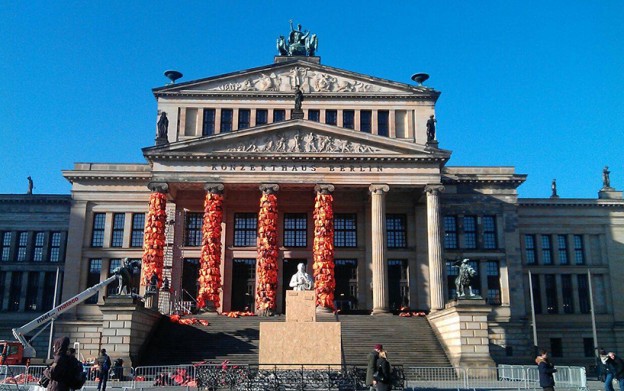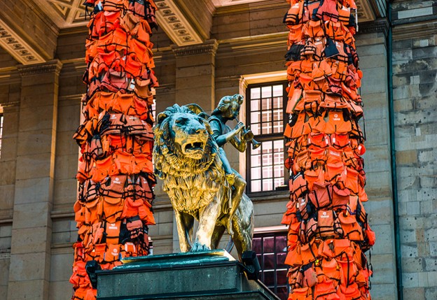 Sanatçı Ai Weiwei, Berlin Konzerthaus’ta gerçekleştirdiği yerleştirmede, yapının ön cephesinde bulunan 6 kolonu 14.000 can yeleğiyle kapladı ve ortalarına da üzerinde #SafePassage (Güvenli Geçiş) yazılı büyük bir bot astı. Dev kolonları parlak bir turuncuya bürüyen yelekler, Türkiye’den Yunanistan’a zor koşullarda deniz yoluyla yeni geçmeye çalışan mültecilere ait.