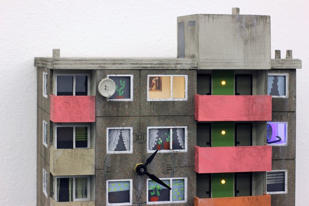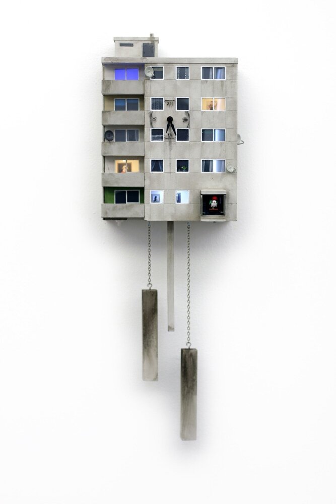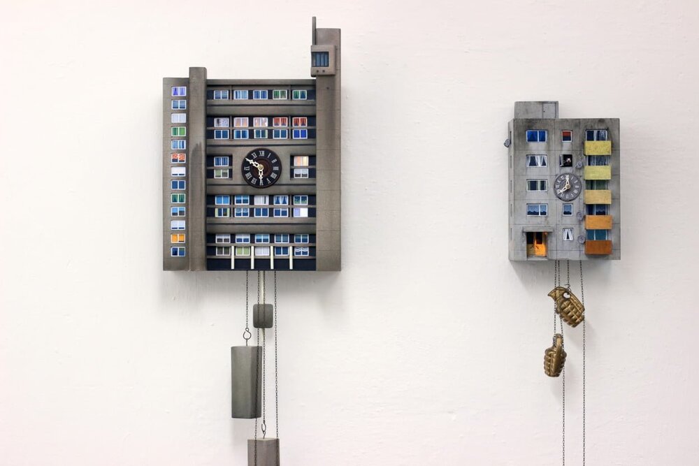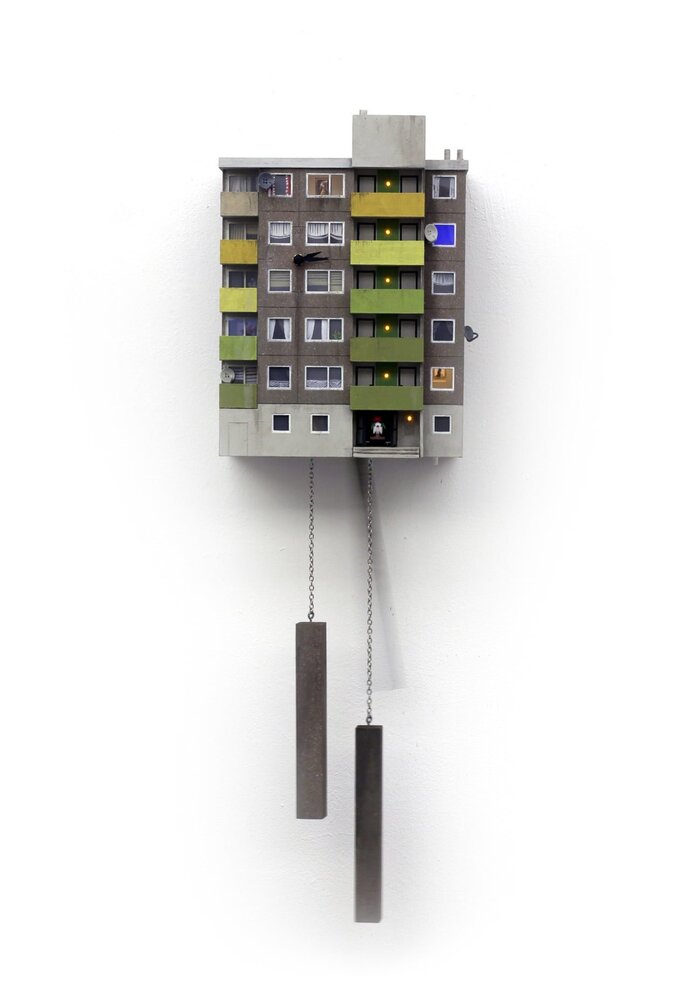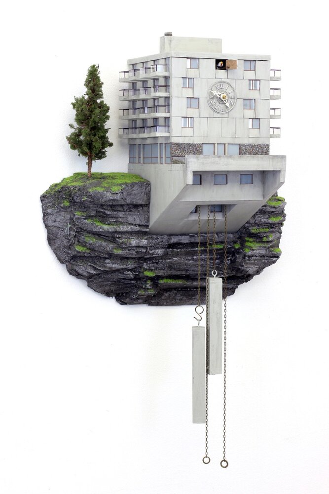 Zimmermann, Brutalist mimar Ernő Goldfinger tarafından yaratılan Glenkerry House (Londra) ve Bauhaus ekolü mimarlarından Marcel Breuer’in tasarladığı Flaine oteli (Fransa) gibi önemli modern mimari örneklerini guguklu saatlere taşımış. Böylece ağaç kulübelerinde konaklayan kuşlar, tıpkı bizler gibi beton yapıların içine taşınmış. Üstelik de binaların isli görüntüsü, çanak antenleri, pencereler, perdeler, yeşil görme hasretiyle cam kenarına yerleştirilen ev bitkileri gibi gerçekçi detaylar da atlanmamış. Gerçekten de hem sevimli hem de hafiften içimizi burkan, ayna etkisi yapan saatler bunlar.