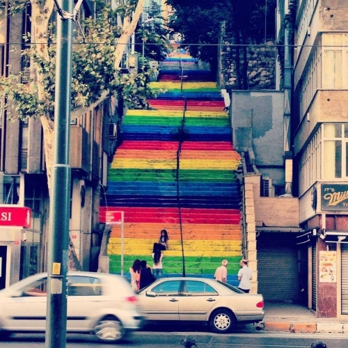 Ağustos ayının sonunda Fındıklı’da boyanan merdivenlerin fotoğrafı Twitter’a düştüğünde boyayanlara ulaşıp merdivenlerin asıl hikayesini yazan ilk mecra olduk.Cihangir’deki Rengarenk Merdivenin Hikayesianaakım medyaya yayıldıktan sonra uzun süre konuşuldu ve bu sürecin başında merdivenler yeniden griye boyandı. Merdivenlerin griye boyandığı gecenin sabahına uyandığımızda direnişte edindiğimiz ruhun bir yansımasını hatırladık ve Bigu’da daha önce yazdığımız bu haberi hatırlattık. Olaylar gerçekten de öngördüğümüz gibi ilerledi ve tıpkı örnekte olduğu gibi tüm Türkiye bulduğu merdiveni rengarenk boyadı. Bigumigu bunu keyifle izledi.