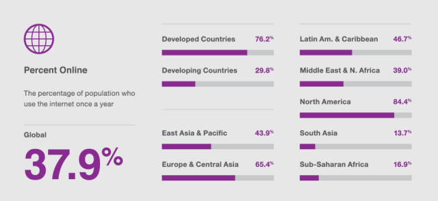 - Facebook’un öncüsü olduğu internet.org’un yaptığı araştırmaya göre dünya nüfusunun sadece %37.9’u internete en az bir bağlandı ve çevrimiçi oldu. Çalışmada aynı zamanda mobil bağlantı erişimi ve kıta tabanlı internete erişim oranı gibi metrikler de yer alıyor.