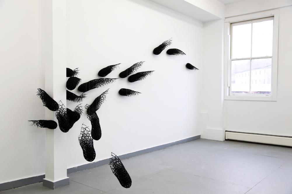 Koreli sanatçı Sui Park, plastik kabloları kullanarak yerleştirmeler ve heykeller yapıyor. Son çalışması FLOW da duvarda yüzen kablodan balıkların uyumunu ahenkle sunuyor. Yerleştirme Vermont Studio Center’da yer alıyor.