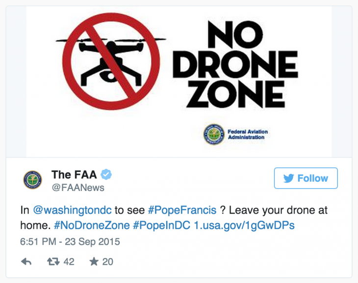 - 1 Şubat Pazar Gazetesi’nde yer verdiğimiz Beyaz Saray’a düşen drone gelişmesinden sonra bina ve bölge çevresinde drone hareketi FAA tarafından yasaklanmıştı. Yasak, Washington’da olağan üstü önlemlerin alındığı Pope Francis’in Beyaz Saray ziyaretinde de gündeme gelmişti. Bu haftaysa Beyaz Saray’ın güneyinde bulunan parkta uçurdukları drone sebebiyle iki kişi tutuklandı.