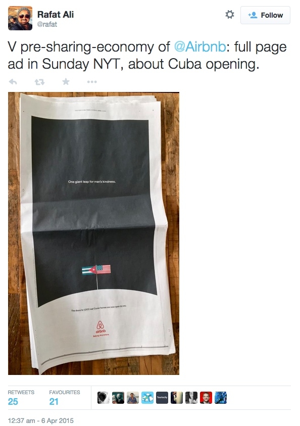 - Geçen hafta bahsettiğimiz Airbnb’nin Küba’ya açılma haberine ekleyebileceğimiz bir nokta ise firmanın New York Times’ın Pazar sayısı kapağına tam sayfa ilan vermesiydi. “Nezaket adına atılan kocaman bir adım” sloganını içeren ilan, iki ülke arasındaki hizmetin başlangıcına ayrı bir tarihsel boyut kazandırdı. İlanda kullanılan başlık astronot Neil Armstrong’un Ay’a ayak basarken attığı cümleye atıfta bulunuyor.