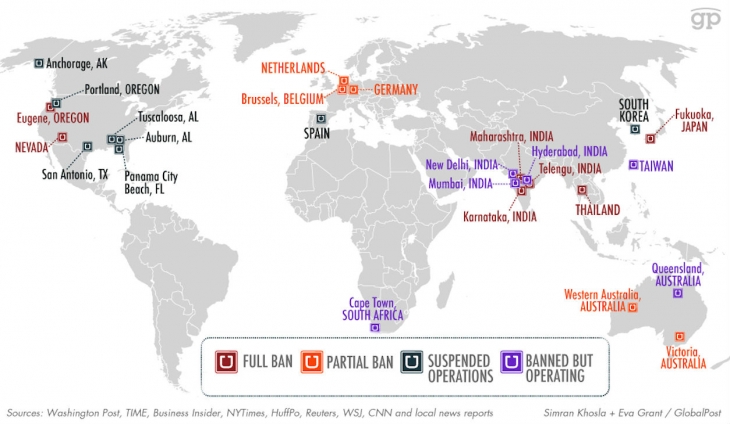 - Geçtiğimiz haftalarda Pazar Gazetesi’nde de yer verdiğimiz Uber’in dünyanın çeşitli noktalarında yasaklanması, bu veriyi görselleştiren bir harita çalışmasını da beraberinde getirdi. ABD, Hindistan, Japonya’nın belli bölgelerinde ve Tayland’da tamamen yasaklanan hizmetin Avustralya’nın belli bölgelerinde ve Hollanda, Belçika ile Almanya’nın tamamında kısmen yasaklandığı görülüyor. ABD’nin bazı eyaletleri, İspanya ve Güney Kore’de şüpheli operasyon kapsamında değerlendirilirken, yasaklanmasına rağmen hizmet verdiği ülkeler arasında da yine Tayvan ve belli bölgeleriyle Hindistan, Avustralya, Güney Afrika bulunuyor.