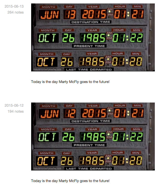 - Back to the Future serisinin hayranları için Marty McFly’ın geleceğe gelmesi büyük anlam taşıyor. Bir Tumblr kullanıcısı ise Today is the Day Marty McFly Went to the Future blogunda 21 Ekim 2013’ten bugüne kadar, bir günü bile atlamadan o klişe görseli güncelliyor.