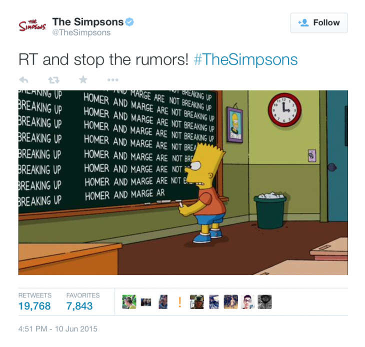 - Yeni sezonda Homer ve Marge Simpson’ın ayrılacağına dair çıkan duyumun kaynağı dizinin yapımcısı Al Jean ile yapılan röportajdı; fakat Jean çok geçmeden çiftin ilişkisi üzerine söylediklerinin çarpıtıldığını esprili bir tweetle ifade etti. Buna dizinin, resmi Twitter hesabından paylaşılan, Bart Simpson’ın ebeveynlerinin ayrılmadığını tahtaya defalarca yazdığı görsel de eşlik etti.