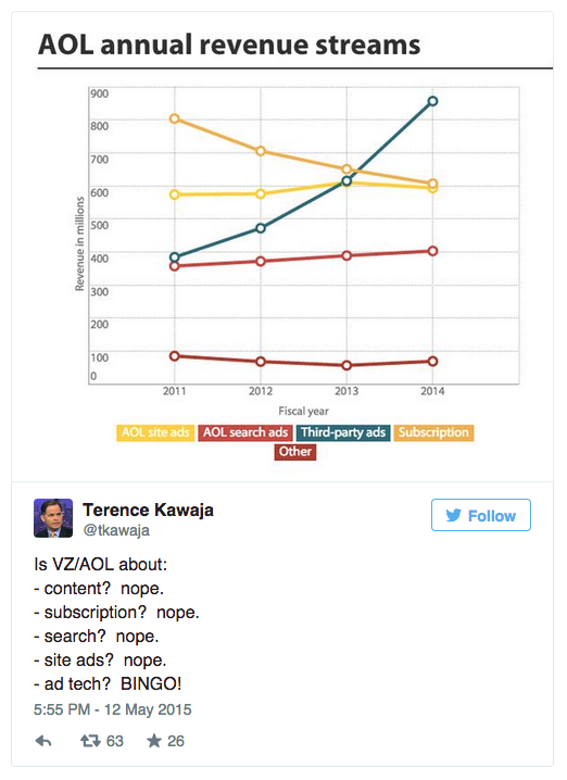 - TechCrunch, The Huffington Post ve Engadget gibi yayınları bünyesinde bulunduran AOL’in satışı yayıncılığın bağımsızlığı sorularını da doğurdu. Ancak yapılan analizler Verizon’un bu satın almayı çevrimiçi reklamcılık ve dijital pazarlama alanında faaliyet gösteren Adtech için yaptığını gösterdi.