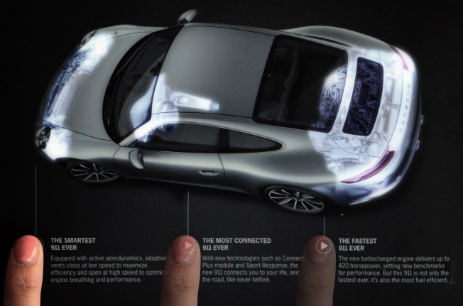 Porsche için Cramer-Krasselt tarafından hazırlanan ve Inc. dergisinin Mayıs sayısında yayımlanan reklam sayesinde okurlar 911’ın üst düzey aerodinamik özelliklerini, internet bağlantılı dijital sistemlerini ve turbo motorunu yalnızca birkaç butona basarak, LED ışıkla aydınlatılan grafik ve yazılı ayrıntılar eşliğinde inceleyebiliyor.