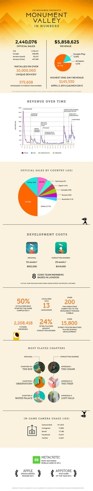 - Mobil işletim sistemlerinin bu yılki en kaliteli oyunlarından Monument Valley, yakaladığı başarıyı hazırladığı infografikle sundu. Geliştiriciler özellikle Android ekosisteminde indirenlerin sadece %5’inin uygulamanın bedelini ödediğini açıklamıştı.