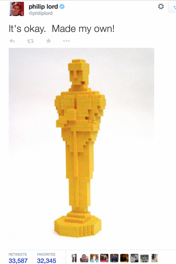 - The Lego Movie’nin en iyi animasyon dalında aday olmaması hakkında filmin yönetmeni Philip Lord’un tepkisi ilgi çekiciydi. Lord: “Sorun değil, kendime bir tane yaptım!” diyerek Lego ile yapılmış bir oscar heykelciği fotoğrafı paylaştı. Bu tweet 30 binden fazla RT ve fav aldı.