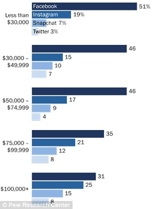 - Pew Research Center tarafından 13-18 yaş arasındaki gençlerle yapılan araştırma %92’sinin her gün, %24’ünün de sürekli çevrim içi olduğunu ortaya koydu. %72’si Facebook’u kullandığı sosyal medya platformları arasında sayarken, sosyoekonomik değişkenlere göre düşük gelirli gençlerin %51’inin temel olarak Facebook kullandığı saptandı. Katılımcıların gelir seviyesi yükseldikçe, Facebook (yine diğer sosyal ağların önünde olsa da) kullanım oranının azaldığı, Snapchat ve Twitter gibi platformlar için oranın arttığı bulundu. Facebook’tan sonra en sık kullanan platformların genel dağılımı da sırasıyla; Instagram, Snapchat, Twitter, Google Plus, Tumblr ve Vine.