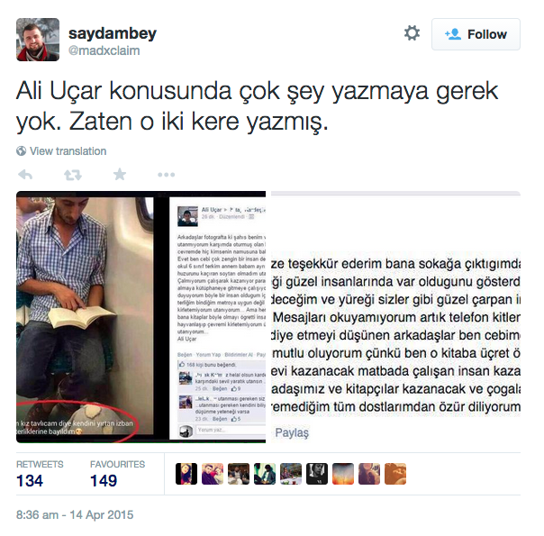 - Birkaç ay önce metroda kitap okuyan birini kıyafetiyle ilişkilendirerek yargılayan fotoğraf bir süre sosyal ağlarda paylaşılmış. Bu hafta ise o kitabı okuyan kişi, Ali Uçar, Facebook hesabı üzerinden konu hakkında görüşlerini belirtti. Verdiği yanıtın ahlaki seviyesi de fotoğraftan daha çok konuşulmasını sağladı.