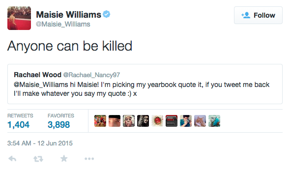 - Bir Twitter kullanıcısı mezuniyet yıllığına yazacağı alıntı için Maisie Williams’dan (Arya Stark) yardım istedi. Maisie Williams ise dizideki ikonik repliklerinden biriyle yanıt verdi.