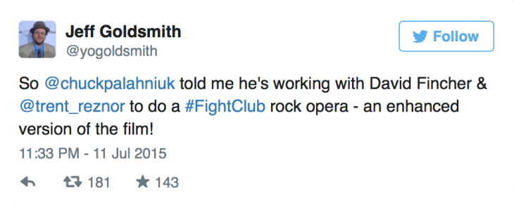 - Hem Chuck Palahniuk tarafından yazılmış romanı hem de sinema filmiyle kültleşmiş eser Fight Club’ın bir rock operası uyarlaması gündemde. Uyarlamanın ise Palahniuk, David Fincher ve Trent Reznor’ın elinden çıkacağı duyuruldu.