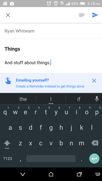 - Google Inbox kendi kendinize e-mail attığınız acil durumları bunun yerine bir hatırlatma olarak karşınıza çıkartacak. Kendinize göndereceğiniz e-mailin gönderilen kısmında çıkan banner’a tıklayınca istediğiniz notu konum ve zaman detaylarıyla buraya düşebileceksiniz.
