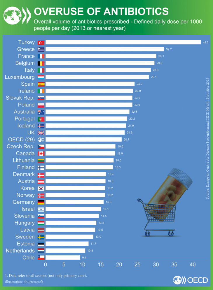 - Ekonomik Kalkınma ve İşbirliği Örgütü (OECD), Dünya Antibiyotik Farkındalık Haftası için ülkelere göre birey başına kullanılan antibiyotik dozunu infografiğe dönüştürdü. İkinci sıradaki Yunanistan’ın 10 puan önünde olan Türkiye, OECD ülkeleri arasında en fazla antibiyotik kullanan ülke oldu.