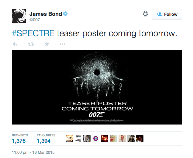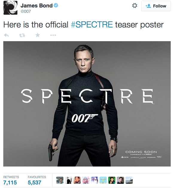 - Yeni James Bond filmi Spectre adına ilginç bir pazarlama iletişimi olarak; Twitter’da filme ait ön gösterim posterine bir ön gösterim yapıldı.