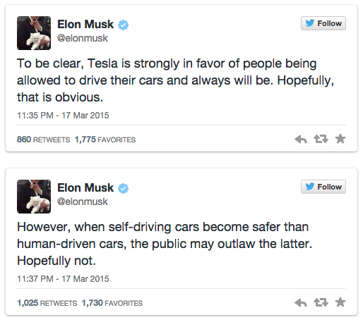 - Tesla Motors’un kurucusu ve Genel Yöneticisi Elon Musk, gelecekte sürücülerin kullandığı otomobillerin yasadışı olacağına inandığını söyledi. “Mekanik yönetimleri insanlardan daha iyi olan bilgisayarlar, kusursuz çalışmalarıyla insanları ekarte edip sürücüsüz araçları standart taşıt kılacak.” sözleriyle görüşünü açıkladı.