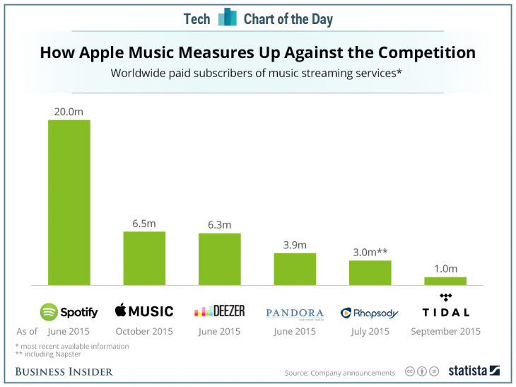 - 30 Haziran’da yayınlanan Apple Music, Statista’nın yaptığı araştırmaya göre pazarın en büyük ikinci platformu konumunda. 3 aylık ücretsiz deneme süreci sonrası 30 Eylül’den itibaren ücretli servis sunan Apple Music 6.5 milyon kullanıcıyla, Spotify dışındaki tüm servislerden daha fazla ücretli aboneye sahip.