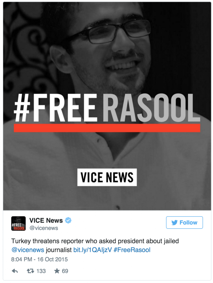 - Vice, 27 Ağustos’ta Diyarbakır’da tutuklanan gazeteci Mohammed Rasool’un serbest bırakılması için Çarşamba günü tüm sosyal medya sayfalarını kararttı.