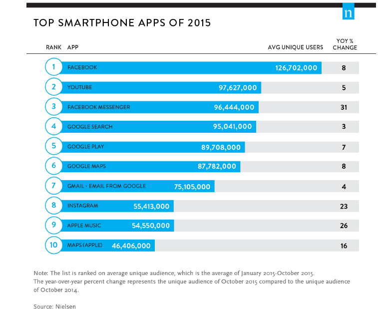 - Nielsen’in araştırmasına göre ABD çapında en çok kullanılan 10 uygulamanın beşi Google’a, ikisiyse Apple’a ait.
