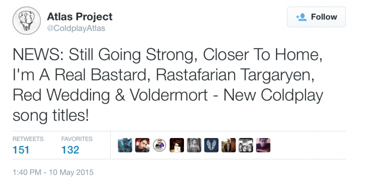 - İngiltere’nin bir başka gururu olan Coldplay de yeni albümü A Head Full of Dream üzerinde çalıştıklarını duyururken ColdplayAtlas adlı hesabın albümdeki bazı şarkıların adlarını paylaşması da dikkat çekti.