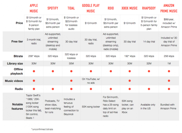 - The Verge ise Apple Music, Spotify, Tidal, Google Play Music ve daha birçok müzik servisini çeşitli parametreleri kullanarak kıyasladı.