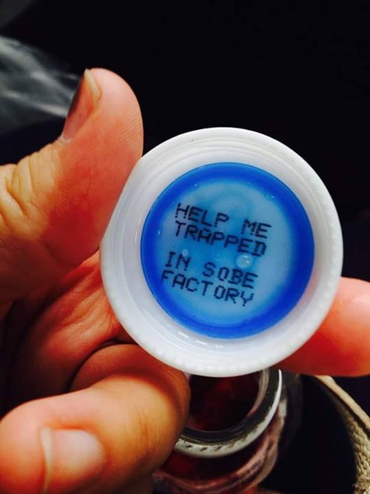 - ABD’de bulunan içecek markası SoBe, tüketicileriyle eğlenceli bir iletişim kurmak için kapaklarının altına ”Benimle evlenir misin?”, “O kız da böyle söylerdi.” gibi minik notlar yazıyor. Fakat son olarak yazdığı “Yardım edin SoBe fabrikasında esir edildim.” mesajı büyük tepki çekti.