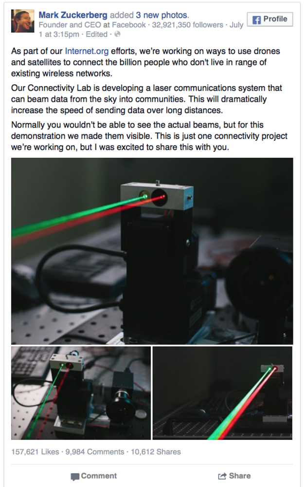 - Zuckerberg internet.org projesiyle uzak mesafelere veri iletimini hızlandırmak amacıyla Connectivity Lab’de geliştirdikleri internet lazerlerini kullanma planını da açıkladı.