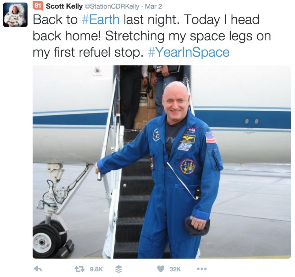 - NASA astronotlarından Scott Kelly, Uluslararası Uzay İstasyonu’ndaki yolculuğunu tamamlayarak dünyaya döndü. 340 günü yerçekimsiz geçiren astronot daha önce üç kez Pazar Gazetesi’ne konuk olmuştu.