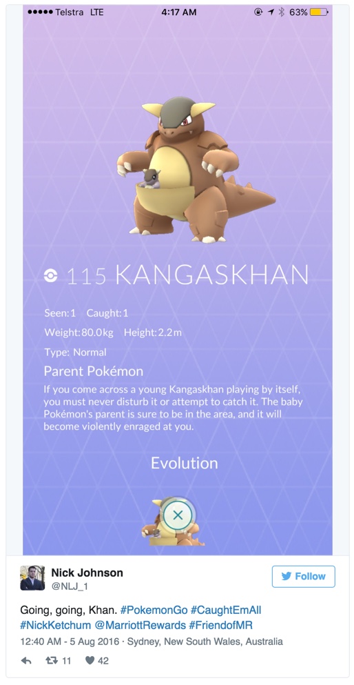 Kuzey Amerika bölgesindeki yakalanabilen tüm Pokémonları herkesten önce yakalayan Nick Johnson, oyunda bölgelere özel olarak konan diğer Pokémonları da yakalayarak Pokédex’i tamamladı. Son olarak Avustralya’da Kangaskan arayan Johnson’a yerel oyunculardan birisi Snapchat’ten pokémon’un bulunduğu yeri göndermiş. Ardından Uber ile oraya doğru yolan çıkan Johnson yol çalışmasından ötürü araçla devam edemeyince 5 blok koşmuş ve Kangaskhan’ı yakalamayı başarmış. Johnson’ın Pokédex’inde esik olanlar ise henüz oyuna eklenmemiş olan Ditto, 3 efsanevi kuş, Mew ve Mewtwo.