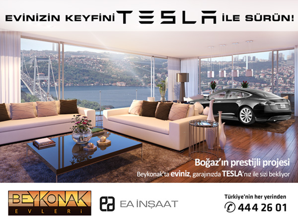 EA Group tarafından yapılan ve artık satış aşamasına geçen Beykonak Evleri, pazarlama stratejisine Tesla’yı da ekledi. Türkiye’de resmi olarak henüz satışı yapılmayan, sürdürülebilirliği ve geri dönüşümü temel dinamikleri olarak belirleyen Tesla, yarattığı yaşam stili algısı sayesinde (yeşil ve yenilenebilir kavramlarının görece içi boşaltılarak) promosyon malzemesine dönüştü.