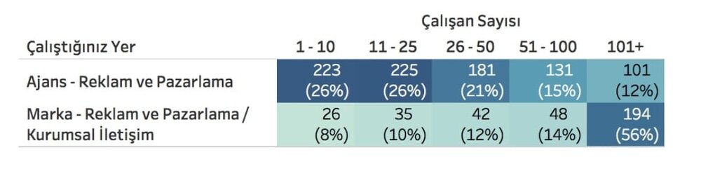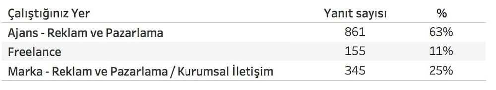 1.361 katılımcının 861’i (%63)’ü ajans çalışanlarından oluşuyor ve bu çalışanların %73’ü çalışan sayısı 50 veya altında olan ajanslarda çalışıyor. Ankete katılan 345 marka çalışanın %56’sı ise çalışan sayısı 101 ve üzeri olan şirketlerde çalışıyor.Ajans çalışanlarının %41’i dijital/sosyal medya ajanslarında çalıştıklarını belirtirken, %37’si geleneksel reklam ajanslarında çalıştıklarını belirtiyor.