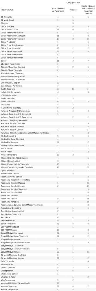 Ankete katılım en çok metin yazarı pozisyonunda çalışanlardan (%10) oldu. Grafik tasarımcı (%8), sanat yönetmeni (%7), ve sosyal medya uzmanı (%5) katılımın yüksek olduğu diğer pozisyonlar. Aşağıda tüm katılımcıların pozisyonlara göre dağılımını görebilirsiniz.
