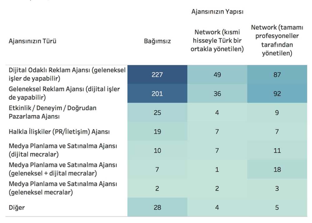 Ajanslardan ankete katılanların %60’ı bağımsız ajanslarında, %27’si tamamı profesyoneller tarafından yönetilen network ajanslarında, %13 ise kısmi hisseyle Türk bir ortakla yönetilen network ajanslarında çalışıyor.Markalarda çalışanlar, anket katılımcılarının %25’ini oluşturuyor. Markalardan katılanların %56’ı 100’ün üzerinde çalışanı olan şirketlerdenken, %44’ü küçük ve orta ölçekli şirketlerden. Marka çalışanlarının %62’si sadece Türkiye’de faaliyet gösteren şirketlerden, %38’i ise uluslararası bir şirketin Türkiye temsilcisi olan şirketlerden.