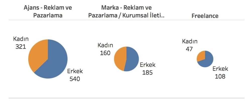 Ankete katılımcılarının %39’unu kadınlar, %61’ini ise erkekler oluşturuyor. Katılımcıların cinsiyet farklılığı göz önüne alındığında marka tarafında çalışanların %46’sı kadınken, bu oran ajanslarda %37’ye, freelance çalışanlarda ise %30’a düşüyor. Bu anlamda ankete katılan sektör çalışanları için kadın ve erkek çalışan sayısı dengesine en fazla marka tarafında yaklaşıldığını söylemek mümkün.