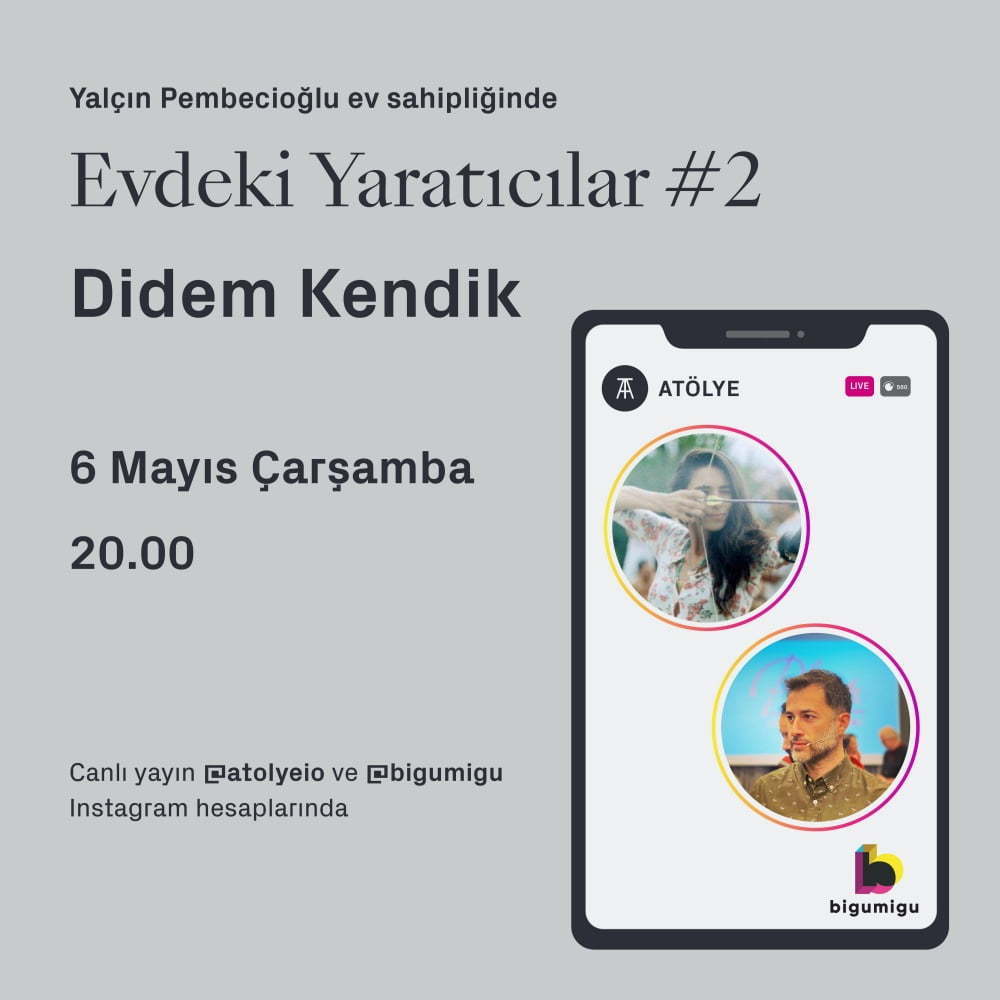 6 Mayıs Çarşamba günü saat 20:00’de Bigumigu’nun eş-kurucusu ve yayın yönetmeni Yalçın Pembecioğlu ile Didem Kendik bir araya gelecek. Together Alone projesi, salgın sonrası Didem Kendik’in hayatında değişenler ve ev ortamında üretim süreci etkinliğin öne çıkan başlıkları arasında olacak. Instagram canlı yayını üzerinden gerçekleşecek olan etkinliği Bigumigu ve ATÖLYE sayfalarından takip edebilirsiniz.