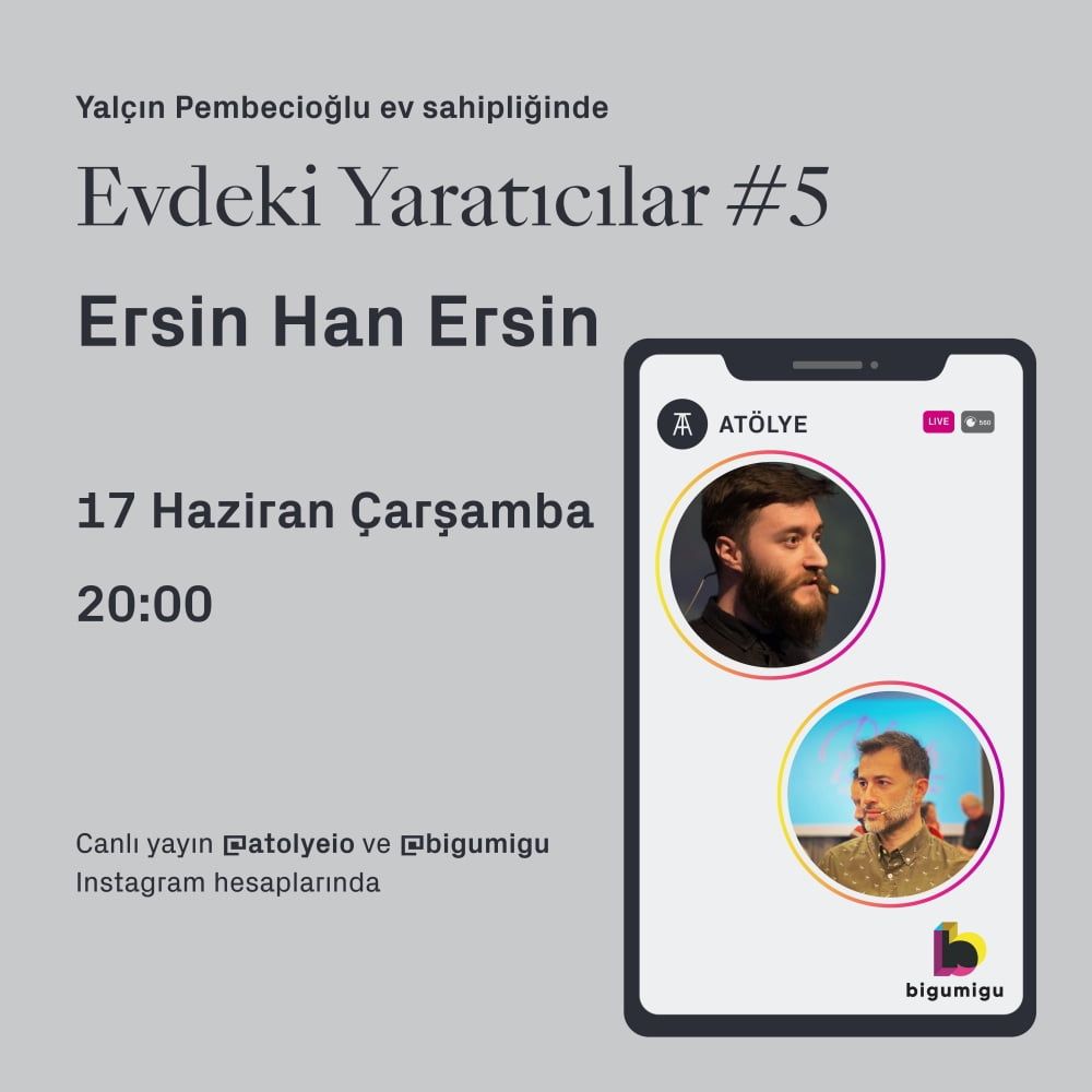 17 Haziran Çarşamba günü saat 20:00’de Bigumigu’nun eş-kurucusu ve yayın yönetmeni Yalçın Pembecioğlu ile Ersin Han Ersin canlı yayında bir araya gelecek. Ersin Han Ersin’in salgın sürecinde uğraştığı işler ve karantina zamanı ev ortamında üretim süreci gibi konular üzerine bir sohbet gerçekleşecek. Instagram canlı yayını üzerinden gerçekleşecek olan etkinliği Bigumigu ve ATÖLYE sayfalarından takip edebilirsiniz.