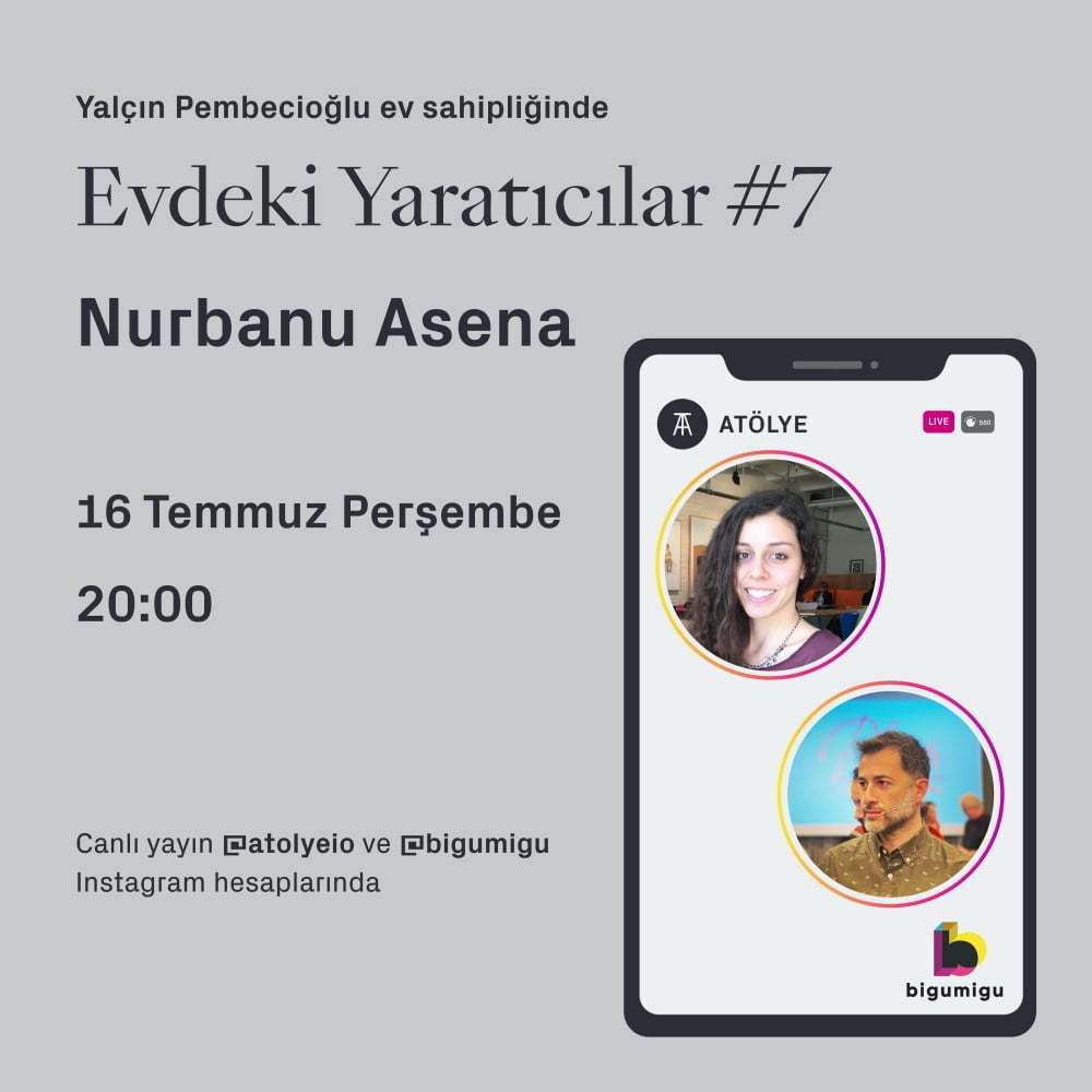 16 Temmuz Perşembe günü saat 20:00’de Bigumigu’nun eş-kurucusu ve yayın yönetmeni Yalçın Pembecioğlu ile Nurbanu Asena canlı yayında bir araya gelecek. Nurbanu Asena’nın salgın döneminde uğraştığı işler, karantina zamanı ve sonrasındaki üretim süreci gibi konular üzerine bir sohbet gerçekleşecek. Instagram canlı yayını üzerinden gerçekleşecek olan etkinliği Bigumigu ve ATÖLYE sayfalarından takip edebilirsiniz.