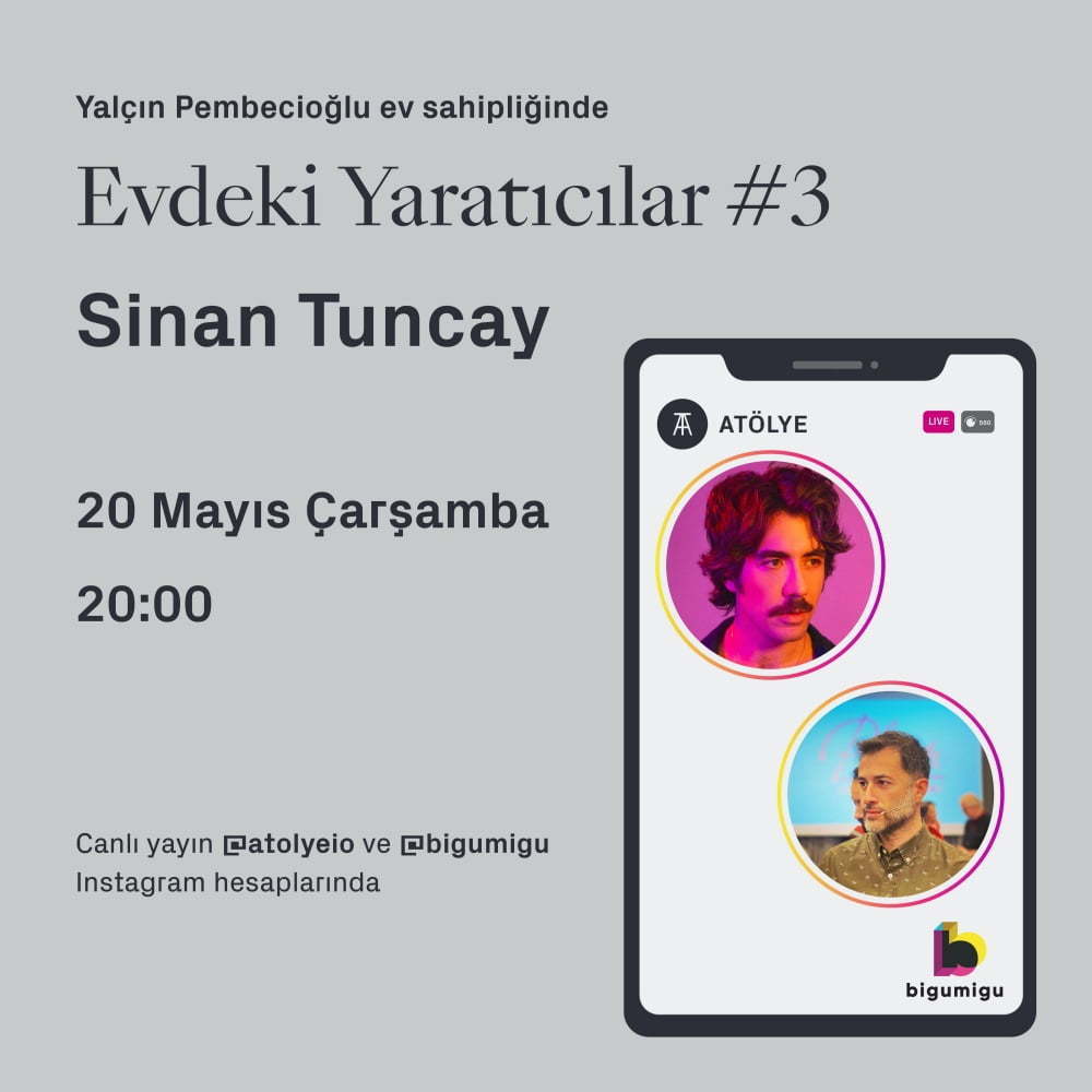 20 Mayıs Çarşamba günü saat 20:00’de Bigumigu’nun eş-kurucusu ve yayın yönetmeni Yalçın Pembecioğlu ile Sinan Tuncay canlı yayında bir araya gelecek. Bez bebeklerinden oluşan Benim Güzel Karantinam projesi, Instagram’da paylaştığı diğer işleri ve karantina zamanı üretim süreci gibi konular üzerine bir sohbet gerçekleşecek. Instagram canlı yayını üzerinden gerçekleşecek olan etkinliği Bigumigu ve ATÖLYE sayfalarından takip edebilirsiniz.