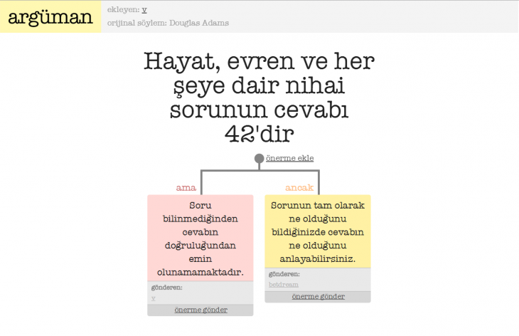 Argüman.org üzerinde “Arguman.org başarılı olacaktır.” “Bugün yarın dün olacak” “Okullarda C#.NET yerine Python öğretilmelidir.” veya ”Steam’in Türk Lirası kabul etmesi Türkiye’deki oyun sektörüne önayak olacaktır” gibi fikir ve bilgi barındıran her önerme kendine yer ediniyor. Açık kaynak kodlu devam eden bu proje için öneri, şikayet ve destek için GitHubüzerinden katkıda bulunabilirsiniz.