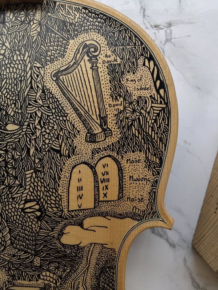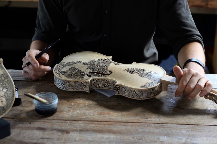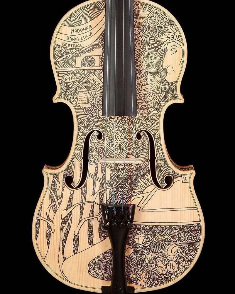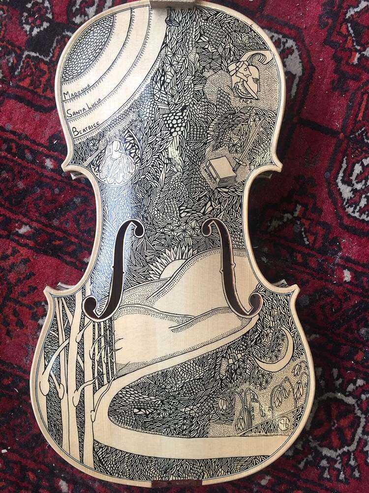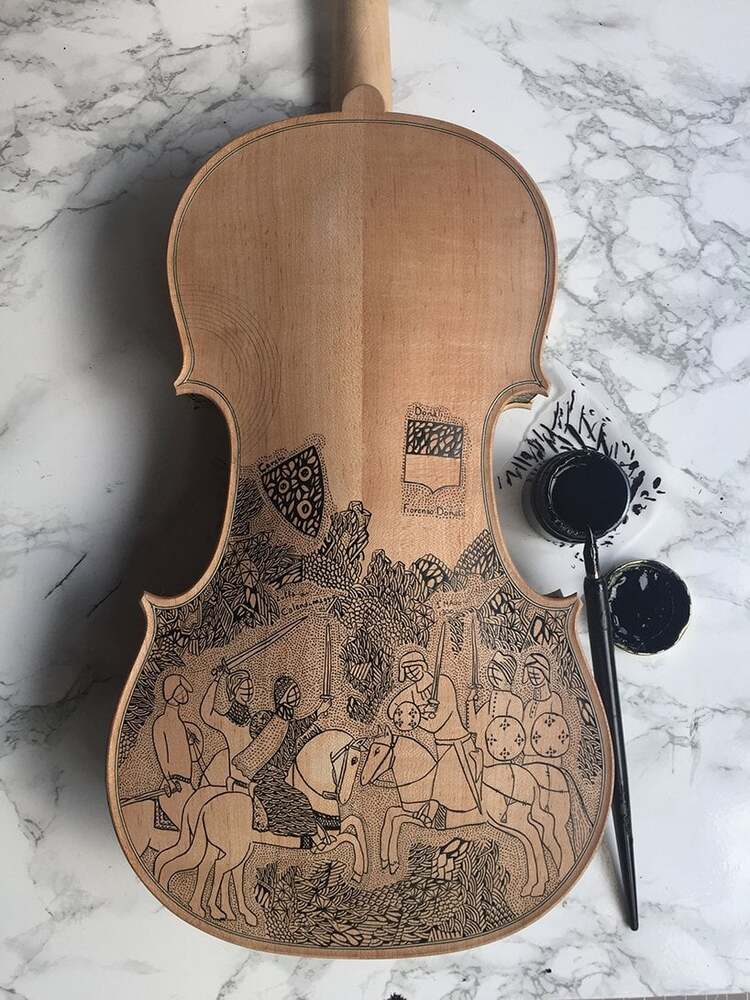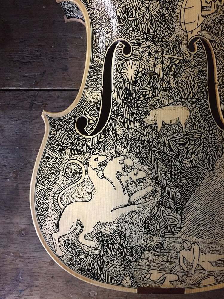 Leonardo Frigo genellikle mezar taşları, ölüler, efsanevi yaratıklar ve savaş sahneleri çiziyor. Bir kemanın üzerine yaptığı çizimi tamamlaması yaklaşık 1 ay sürüyor. Sanatçı, bu el emeği göz nuru enstrümanların kitap gibi okunabileceği fikrinden hoşlanıyor. Böylece enstrümanların yalnızca çalındıkları zaman takdir görmenin ötesine geçebileceğini ve kendi başına bir sanat eseri olabileceğini düşünüyor.