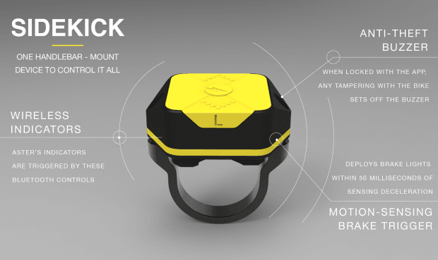 Aster, gidona yerleştirilen Sidekick isimli kontrol cihazı ve Lumos Aster Uygulaması ile görünürlük dışında başka özellikler de sunabiliyor. Aster, Sidekick ve Lumos birbirleriyle Bluetooth üzerinden konuşabiliyorlar. Uygulama üzerinden Aster’in ışık ayarları düzenlenebiliyor, pil azalınca uyarı verilebiliyor ve hırsızlığa karşı koruma önlemleri devreye alınabiliyor. Örneğin, Lumos kullanarak Sidekick’i kilitleyebiliyor, böylece bisiklet kilitinizin üzerine bir kat daha güvenlik önlemi almış oluyorsunuz. Bu sistem devredeyken bisikletiniz 5 saniyeden daha uzun süre hareket ettirilirse alarm çalmaya başlıyor.