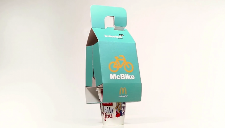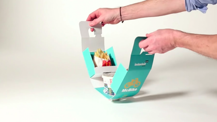 Tribal Buenos Aires’in McDonald’s için tasarladığı McBike isimli al-götür paketler, bisikletin kollarına asılabilecek şekilde tasarlanmış. Kartondan bir sefer tasını andıran tasarımda, hamburger, patates ve içecek altlı üstlü dizili duruyor ve sapından kolayca bisiklete asılıyor. Paketi açtığınızda ise pratik, minik bir tepsiye dönüşüyor.