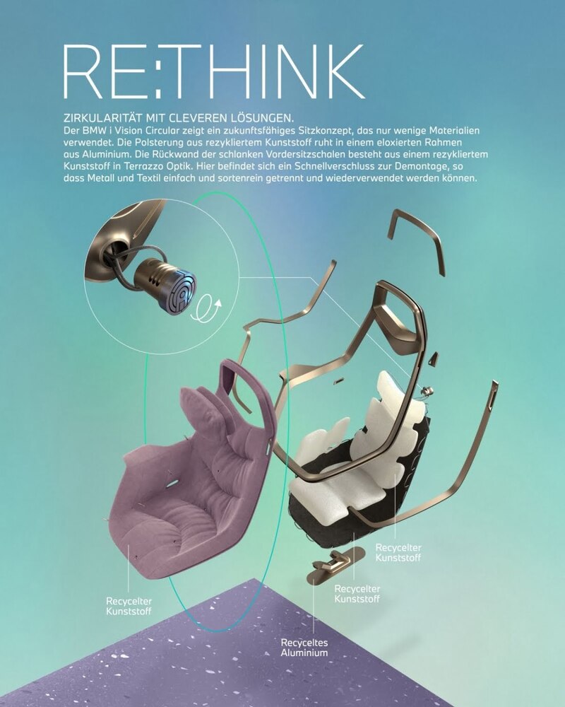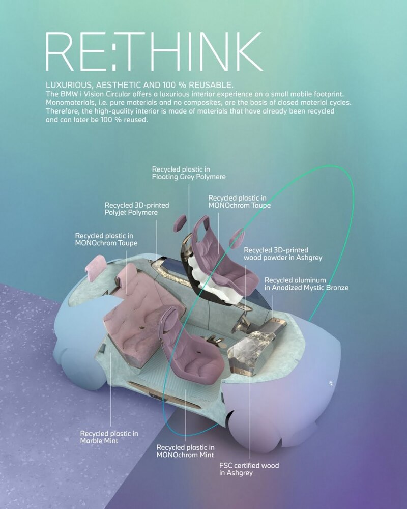 BMW i Vision Circular henüz konsept bir otomobil. Markanın 2040 vizyonunu yansıtıyor. Sürdürülebilirlik hedefleri kapsamında tasarlanan otomobil yüzde 100 geri dönüştürülebilir elektrikli bir araç ve bu dönüşüme araca güç veren pil de dahil. BMW, pillerin yüzde 100 geri dönüştürülebilir olduğunu ve neredeyse tamamen geri dönüşüm döngüsünden elde edilen malzemeler kullanarak üretilebileceğini söylüyor. Otomobilin geri kalanında da boya, deri, krom gibi standart bir araçta karşılaşabileceğimiz malzemeler kullanılmıyor. Ayrıca kompozit malzemeler yerine kablolar, çıtçıtlar ve çabuk açılıp kapanabilen bağlantı elemanları gibi akıllı bağlantılar tercih ediliyor. Otomobil bu bileşenler sayesinde çok hızlı bir şekilde birkaç aletle sökülüp parçalanabiliyor. Tabii aracın bu kadar rahat sökülüp birleştirilebiliyor olması akıllara bazı güvenlik sorunlarını da getiriyor olabilir ancak konsept otomobilin 2040 yılı vizyonunu yansıttığını unutmamakta fayda var.